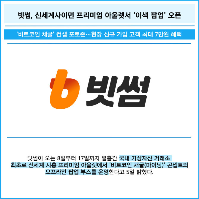 [프라임경제] 빗썸이 오는 8일부터 17일까지 열흘간 국내 가상자산 거래소 최초로 신세계 시흥 프리미엄 아울렛에서 '비트코인 채굴(마이닝)' 콘셉트의 오프라인 팝업 부스를 운영한다고 5일 밝혔다.