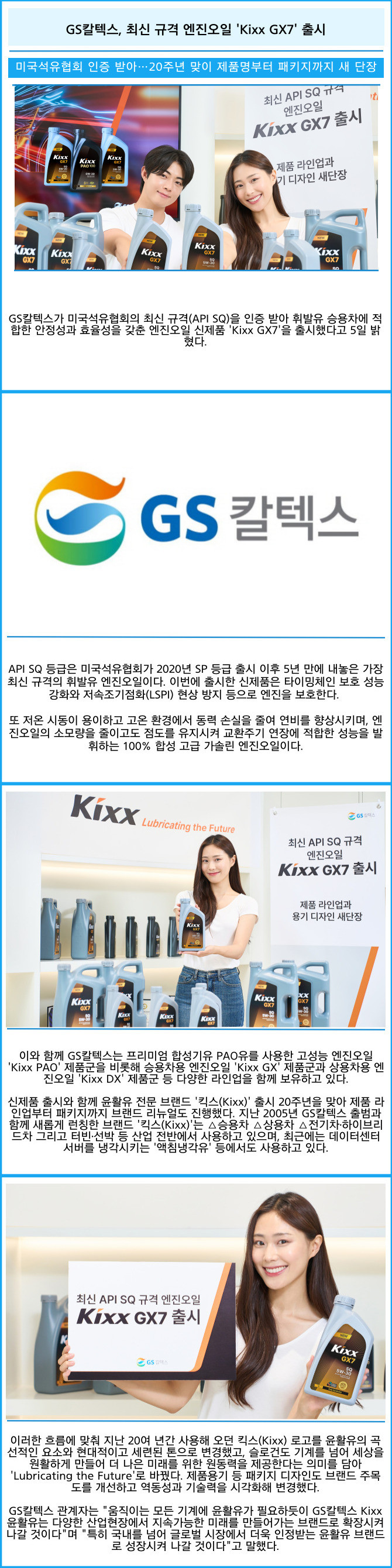 [프라임경제] GS칼텍스가 미국석유협회의 최신 규격(API SQ)을 인증 받아 휘발유 승용차에 적합한 안정성과 효율성을 갖춘 엔진오일 신제품 'Kixx GX7'을 출시했다고 5일 밝혔다.