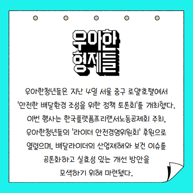 [프라임경제] 우아한청년들은 지난 4일 서울 중구 로얄호텔에서 '안전한 배달환경 조성을 위한 정책 토론회'를 개최했다. 이번 행사는 한국플랫폼프리랜서노동공제회 주최, 우아한청년들의 '라이더 안전경영위원회' 후원으로 열렸으며, 배달라이더의 산업재해와 보건 이슈를 공론화하고 실효성 있는 개선 방안을 모색하기 위해 마련됐다.