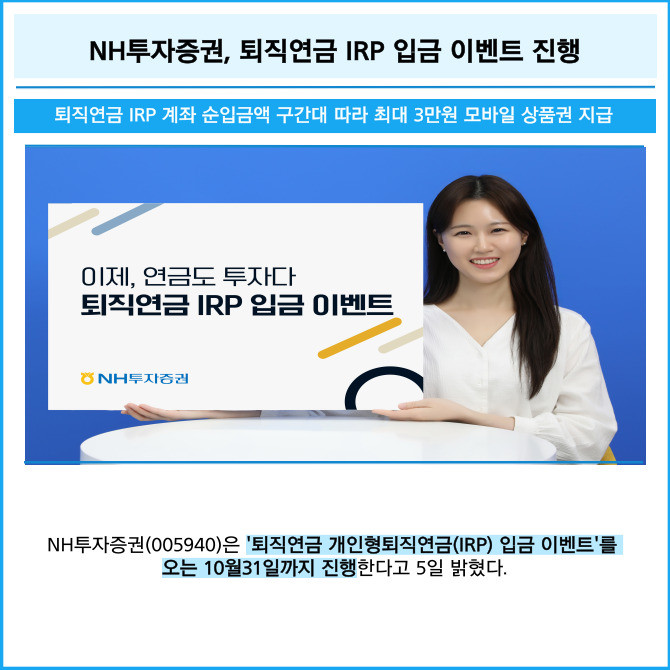 [프라임경제] NH투자증권(005940)은 '퇴직연금 개인형퇴직연금(IRP) 입금 이벤트'를 오는 10월31일까지 진행한다고 5일 밝혔다.