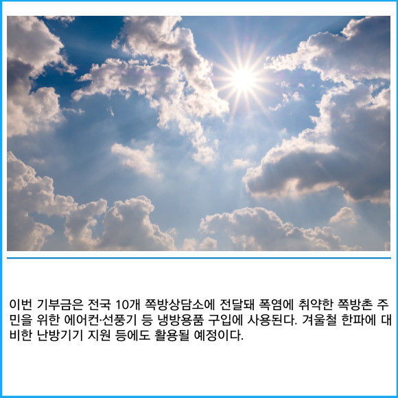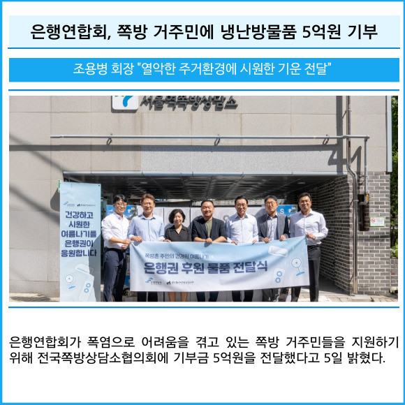 [프라임경제] 은행연합회가 폭염으로 어려움을 겪고 있는 쪽방 거주민들을 지원하기 위해 전국쪽방상담소협의회에 기부금 5억원을 전달했다고 5일 밝혔다.