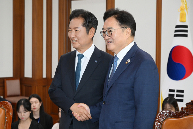 이에 우 의장은 정 대표 취임을 축하하면서 "앞으로 국정이 안정되고 국민들 삶을 편안하게 할 수 있도록 국회와 잘 협력해 나가자"며 "경제와 민생이 지금 매우 어렵고 세계정세가 급변하고 있다. 어떤 상황에서도 국민의 먹고사는 문제, 국민 삶을 편안하게 만드는 문제를 중심에 두고 노력해야 한다"고 했다.