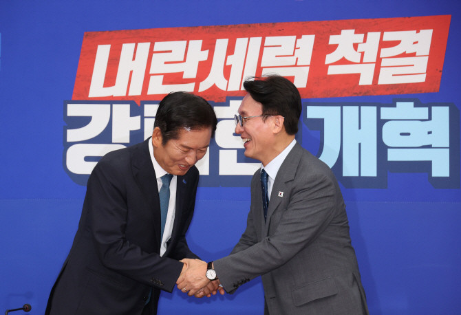 정 대표는 5일 국회 의장접견실에서 취임 인사를 위해 우 의장을 예방해 "검찰·언론·사법 개혁, 내란 세력 척결에 따른 여러 입법과 제도개선에 대해 의장님께서 비상계엄 해제할 때의 결연한 심정으로 결단을 많이 해주셨으면 좋겠다"고 말했다.