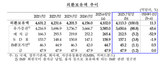 한국은행(이하 한은)이 5일 발표한 '7월 말 외환보유액'에 따르면 지난달 말 기준 외환보유액은 4113억3000만달러로 전월 말(4102억달러) 대비 11억3000만달러 증가했다.