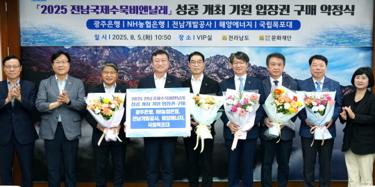 [프라임경제] 전남문화재단(전남국제수묵비엔날레사무국)은 5일 전남도청 VIP실에서 지역 주요 기업, 대학 등과 2025 전남국제수묵비엔날레 성공개최를 위한 입장권 구매약정식을 개최했다고 밝혔다.