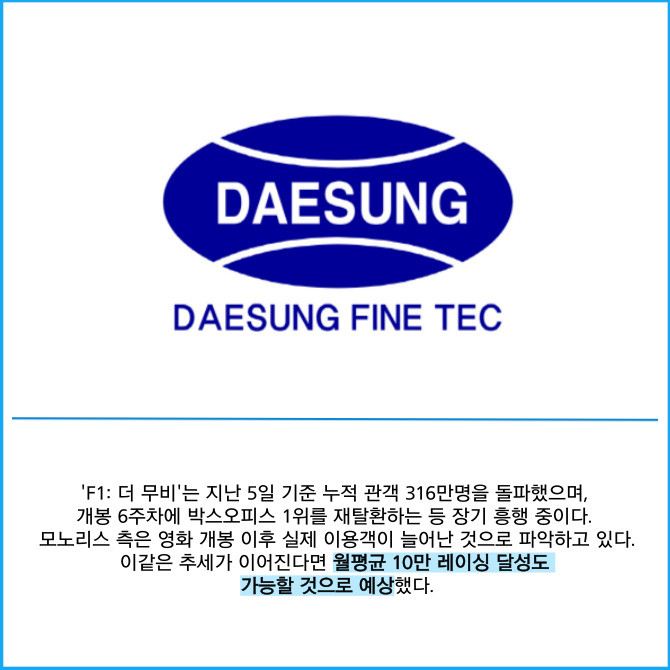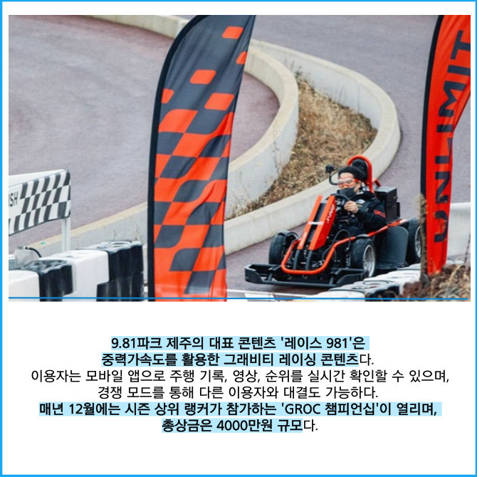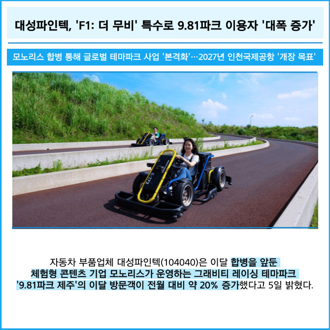 [프라임경제] 자동차 부품업체 대성파인텍(104040)은 이달 합병을 앞둔 체험형 콘텐츠 기업 모노리스가 운영하는 그래비티 레이싱 테마파크 '9.81파크 제주'의 이달 방문객이 전월 대비 약 20% 증가했다고 5일 밝혔다.