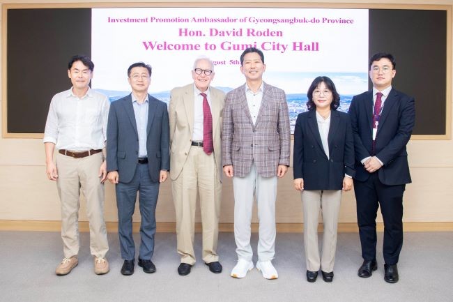 김장호 구미시장은 5일 시청 국제통상협력실에서 '데이비드 로든 경상북도 투자유치 홍보대사(이하 홍보대사)'를 접견하고, 구미시 투자환경을 소개하며 협력을 요청했다.