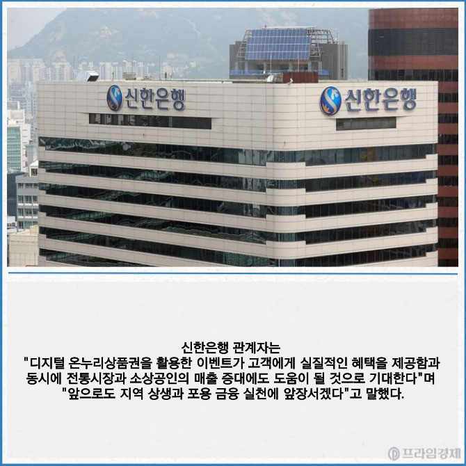 [프라임경제] 신한은행이 신한카드와 오는 31일까지 전통시장과 소상공인 지원을 위해 '디지털 온누리상품권 캐시백' 이벤트를 진행한다고 5일 밝혔다.