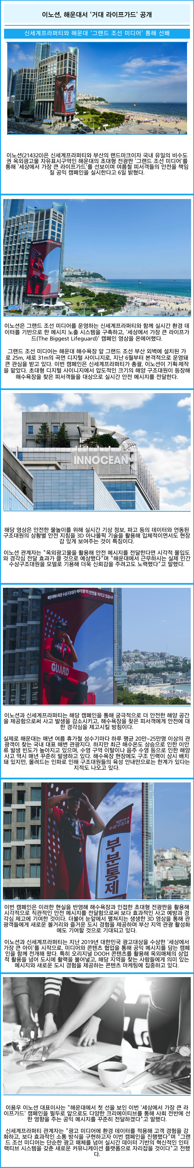 [프라임경제] 이노션(214320)은 신세계프라퍼티와 부산의 랜드마크이자 국내 유일의 비수도권 옥외광고물 자유표시구역인 해운대의 초대형 전광판 '그랜드 조선 미디어'를 통해 '세상에서 가장 큰 라이프가드'를 선보이며 여름철 피서객들의 안전을 책임질 공익 캠페인을 실시한다고 6일 밝혔다.