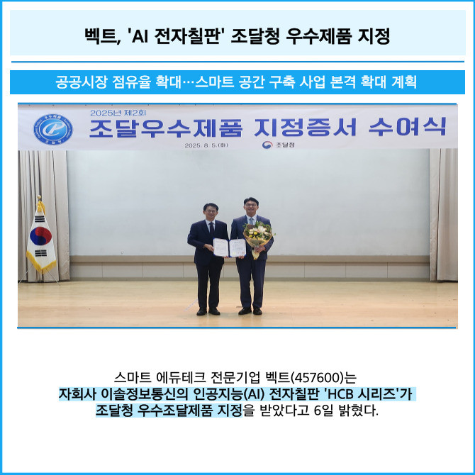 [프라임경제] 스마트 에듀테크 전문기업 벡트(457600)는 자회사 이솔정보통신의 인공지능(AI) 전자칠판 'HCB 시리즈'가 조달청 우수조달제품 지정을 받았다고 6일 밝혔다.
