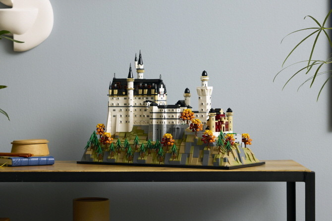 먼저 '노이슈반슈타인 성'은 총 3,455개의 브릭을 사용해 독일 바이에른주의 고풍스러운 성과 주변 경관을 섬세하게 표현했다. 안뜰로 이어지는 길과 높이 솟은 첨탑과 포탑, 양쪽으로 경사진 박공지붕 등 건축물의 특징을 모두 담고 있다. 초록색과 주황색 잎사귀 모양 브릭을 활용하면 여름철과 가을철 조경을 손쉽게 바꿔 연출할 수 있다.
