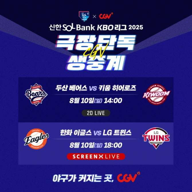 또한 CGV는 오는 10일에 진행되는 '한화 이글스 vs LG 트윈스' 경기와 '두산 베어스 vs 키움 히어로즈' 경기를 생중계한다.