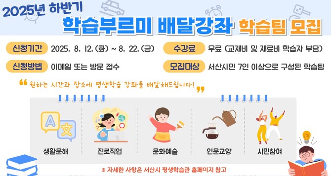 [프라임경제] 충남 서산시(시장 맹정호)는 오는 8월12일부터 22일까지 2025년 하반기 학습부르미 배달강좌에 참여할 학습팀을 모집한다고 밝혔다.