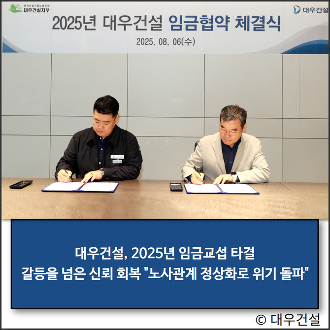 대우건설 관계자는 "노사가 이번 합의를 통해 갈등을 해소하고 지속 가능한 상생의 노사관계를 향한 실질적인 진전을 이뤘다"며 "앞으로도 노사 간 한층 두터운 신뢰와 협력을 통해 위기 상황을 함께 돌파할 것"이라고 말했다.