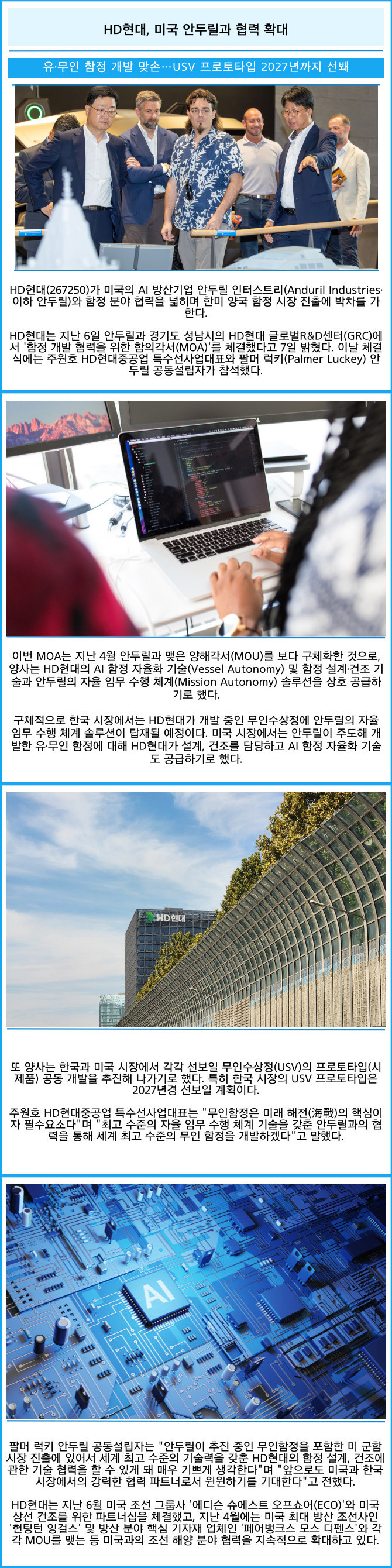 HD현대는 지난 6일 안두릴과 경기도 성남시의 HD현대 글로벌R&D센터(GRC)에서 '함정 개발 협력을 위한 합의각서(MOA)'를 체결했다고 7일 밝혔다. 이날 체결식에는 주원호 HD현대중공업 특수선사업대표와 팔머 럭키(Palmer Luckey) 안두릴 공동설립자가 참석했다.