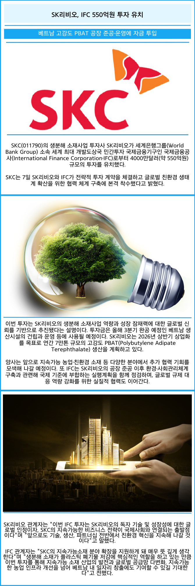 SKC는 7일 SK리비오와 IFC가 전략적 투자 계약을 체결하고 글로벌 친환경 생태계 확산을 위한 협력 체계 구축에 본격 착수했다고 밝혔다.