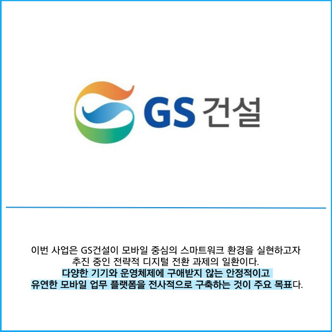 [프라임경제] 인공지능(AI)·모바일 플랫폼 전문기업 유라클(088340)은 GS건설의 차세대 디지털 업무환경 조성을 위한 '모바일 워크플레이스(Mobile Workplace)' 구축 사업을 수주했다고 7일 밝혔다.