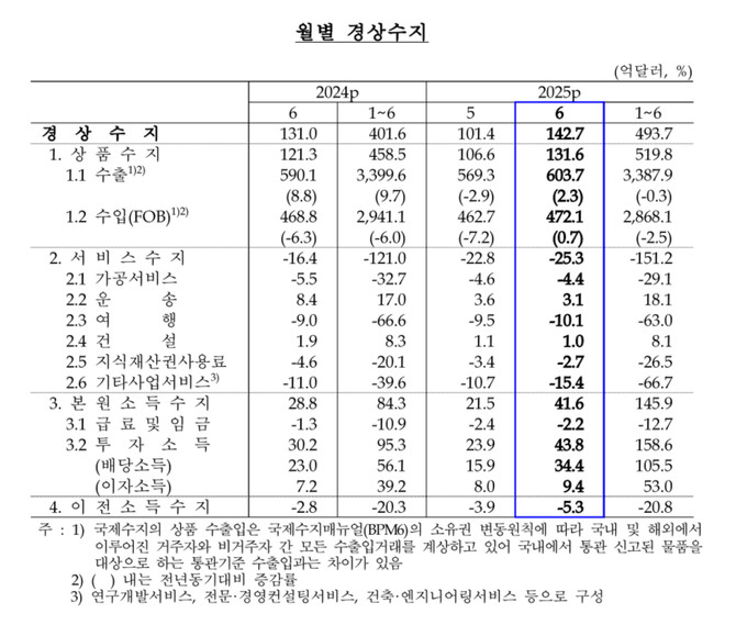 7일 한국은행(이하 한은)이 발표한 '2025년 6월 국제수지(잠정)'에 따르면 지난 6월 경상수지는 142억7000만달러 흑자를 달성했다. 전월(101억4000만달러) 대비 41억3000만 달러, 전년 6월(131억달러) 대비 11억7000만달러 늘었다. 이같은 흑자는 월별 기준 역대 최대 규모다.