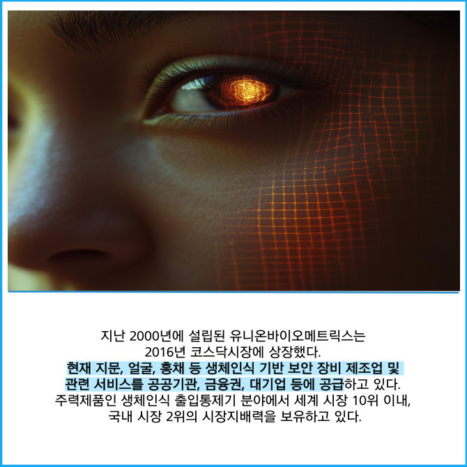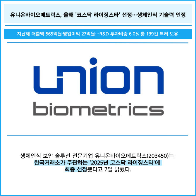 [프라임경제] 생체인식 보안 솔루션 전문기업 유니온바이오메트릭스(203450)는 한국거래소가 주관하는 '2025년 코스닥 라이징스타'에 최종 선정됐다고 7일 밝혔다.