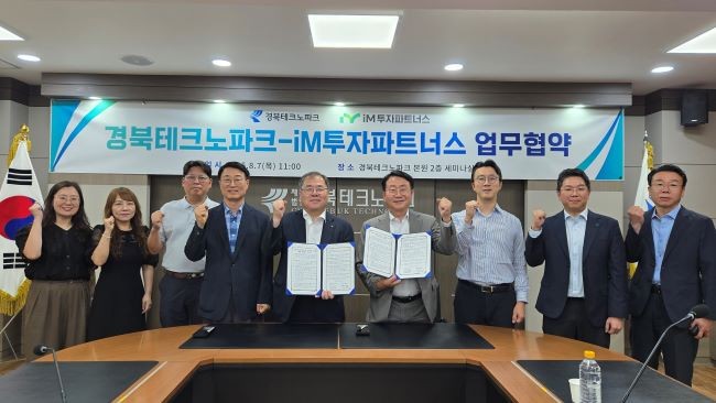 협약식에는 경북테크노파크 하인성 원장을 비롯해 정진환 기업지원단장 등 관계자 7명과 아이엠투자파트너스 권준희 대표, 노경욱 상무, 양준영 이사 등 3명이 참석해 상호 협력 의지를 확인했다.