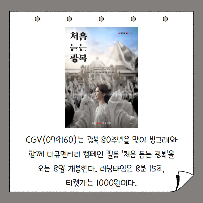 [프라임경제] CGV(079160)는 광복 80주년을 맞아 빙그레(005180)와 함께 다큐멘터리 캠페인 필름 '처음 듣는 광복'을 오는 8일 개봉한다. 러닝타임은 8분 15초, 티켓가는 1000원이다.