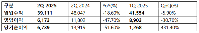 2분기 실적만 집계하면 △영업수익 391억원 △영업이익 61억원 △당기순이익 67억원으로 전년 같은 기간 대비 각각 18.6% △47.7% △51.6% 하락했으며, 2025년 1분기 대비 영업수익과 영업이익은 5.9%, 30.7% 감소한 반면 일시적으로 법률비용이 발생한 1분기 대비 2분기 당기순이익은 431.4% 올랐다.