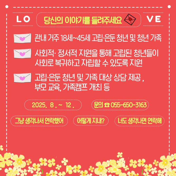 모집 대상은 관내 거주 18~45세 고립은둔 청년 및 청년가족이며, 참여를 희망하는 대상자는 통영시 기획예산실 인구청년정책팀으로 문의하면 된다.