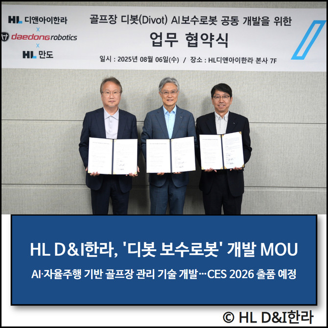 HL D&I한라는 지난 6일 서울 송파구 본사 대회의실에서 자율주행 제어·센서 기술 보유 기업 'HL만도(204320)', 인공지능(AI) 로봇 전문기업 '대동로보틱스'와 함께 '디봇 보수로봇' 개발을 위한 양해각서(MOU)를 체결했다고 7일 밝혔다.