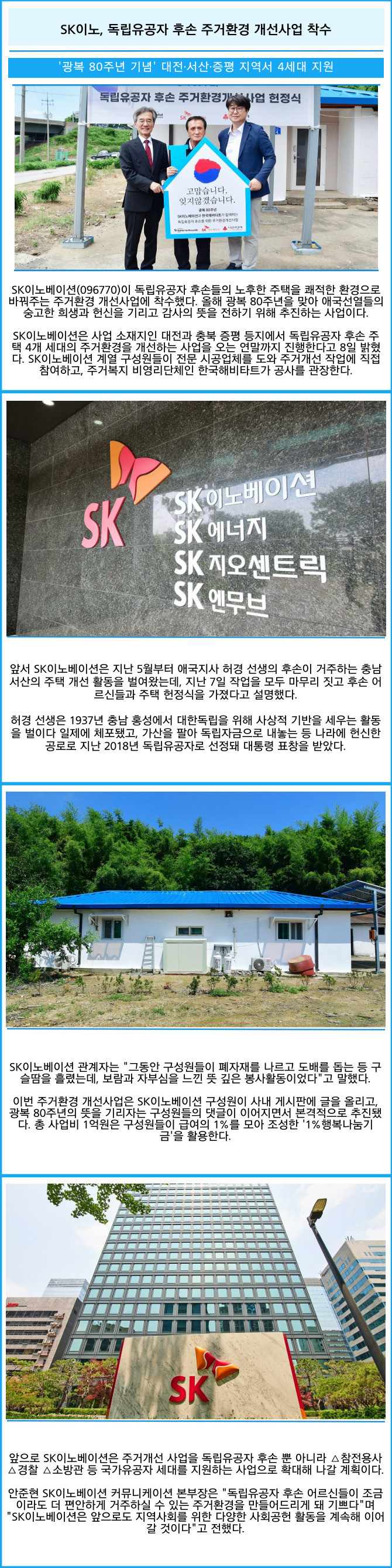 [프라임경제] SK이노베이션(096770)이 독립유공자 후손들의 노후한 주택을 쾌적한 환경으로 바꿔주는 주거환경 개선사업에 착수했다. 올해 광복 80주년을 맞아 애국선열들의 숭고한 희생과 헌신을 기리고 감사의 뜻을 전하기 위해 추진하는 사업이다.