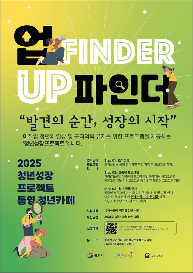 참여 신청은 통영시청년센터 홈페이지, 방문 접수, QR코드를 통한 간편 신청이 가능하며, 관련 문의는 통영시청년센터 청년성장프로젝트 사업팀으로 문의하면 된다.