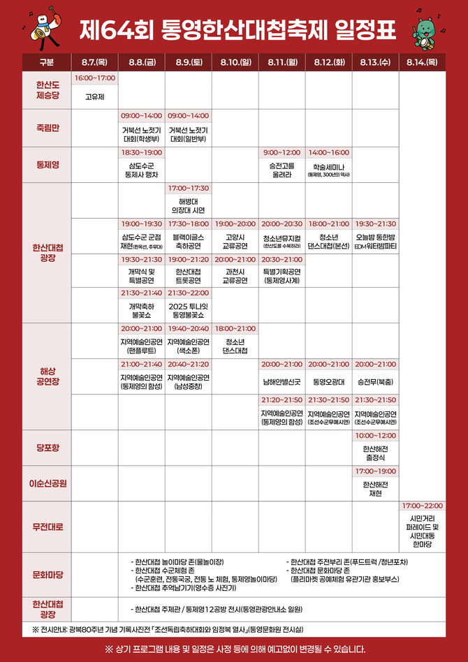 이 외에도 'EDM 워터밤 파티' '청소년 댄스대첩' '승전고를 울려라' '특별기획공연 통제영 사계' '청소년 뮤지컬' 등 젊은 세대를 겨냥한 콘텐츠를 강화했으며, △고양시 교류 공연 △과천시 교류 공연 △남해안별신굿 △통영오광대 △승전무 △지역예술인 공연 등 남녀노소 누구나 즐길 수 있는 다양한 프로그램을 준비했다.