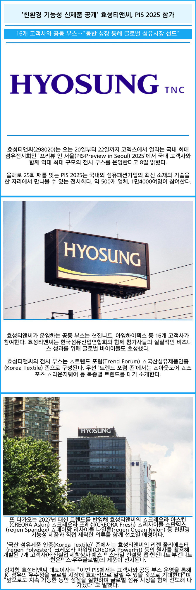 [프라임경제] 효성티앤씨(298020)는 오는 20일부터 22일까지 코엑스에서 열리는 국내 최대 섬유전시회인 '프리뷰 인 서울(PIS·Preview in Seoul) 2025'에서 국내 고객사와 함께 역대 최대 규모의 전시 부스를 운영한다고 8일 밝혔다.
