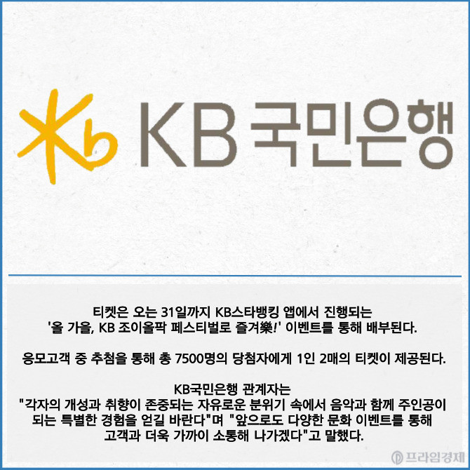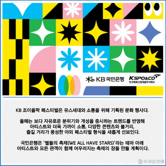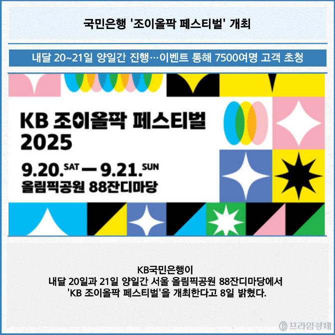 [프라임경제] KB국민은행이 내달 20일과 21일 양일간 서울 올림픽공원 88잔디마당에서 'KB 조이올팍 페스티벌'을 개최한다고 8일 밝혔다.