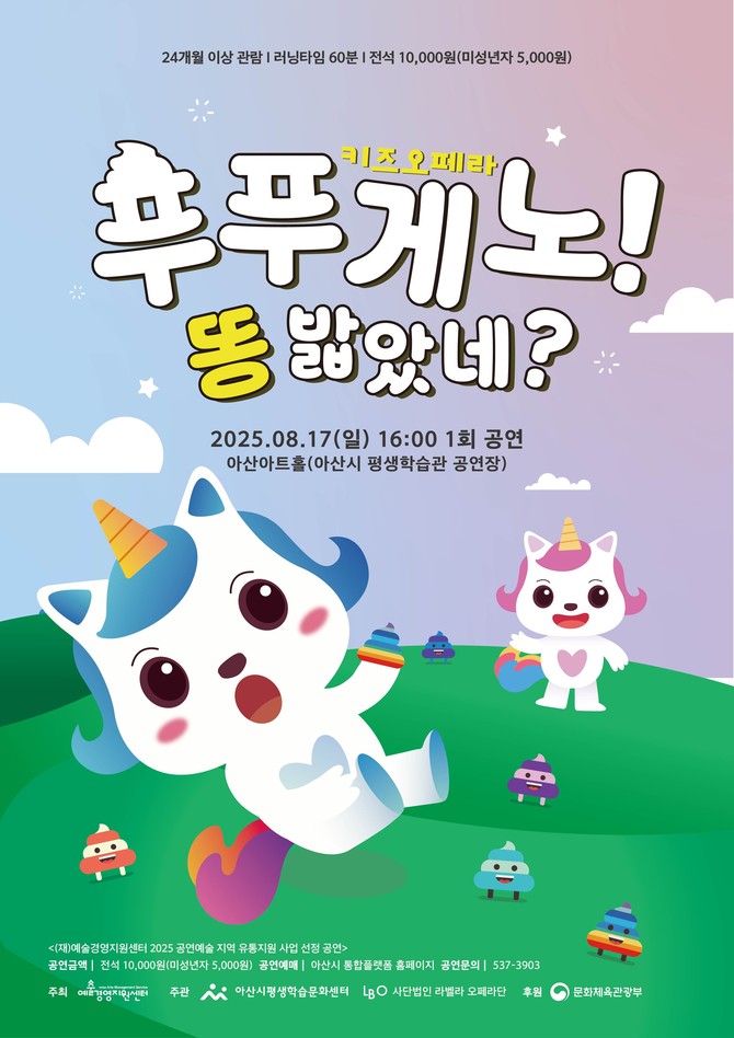 충남 아산시(시장 오세현)가 '2025 공연예술 유통 지원사업'에 선정된 작품 키즈오페라 '푸푸게노! 똥 밟았네?'를 8월 방학 시즌을 맞아 17일 아산아트홀에서 개최한다.