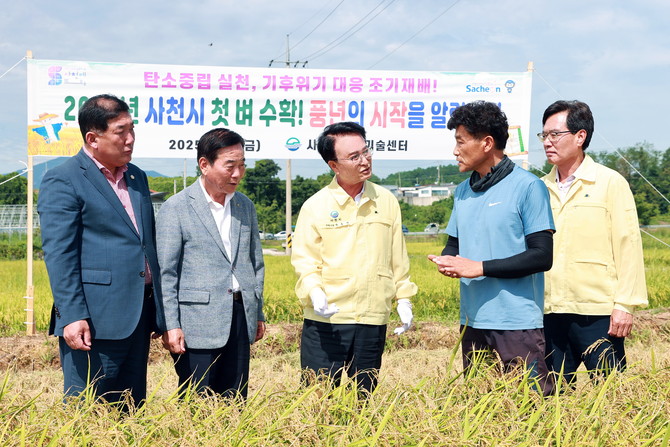 사천시가 서포면 다평리 1434-4번지 일원에서 2025년 첫 벼(빠르미) 수확 행사를 개최했다.
