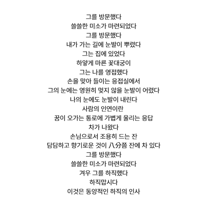 10여 년이 지나 나이 50줄에 들어선 박 시인이 이 여인을 만났다. "백발이 되어 소원했던 사람을 이제 방문하게 됐다. 덧없이 흐른 세월이여, 끝없이 눈발이 내리는구나."라며 시 한 편을 남겼다.