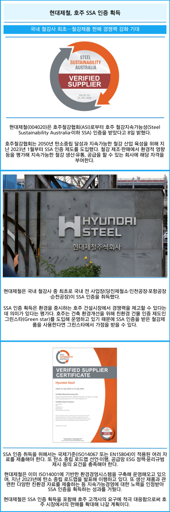 [프라임경제] 현대제철(004020)은 호주철강협회(ASI)로부터 호주 철강지속가능성(Steel Sustainability Australia·이하 SSA) 인증을 받았다고 8일 밝혔다.