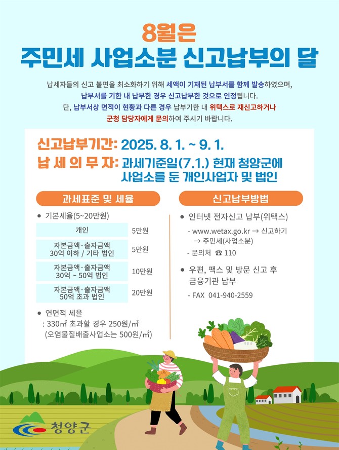 충남 청양군(군수 김돈곤)은 2025년도 주민세 개인분 1억6000만원과 주민세 사업소분 2억3000만원을 부과하고 납부기한 9월 1일까지 납부를 당부했다.