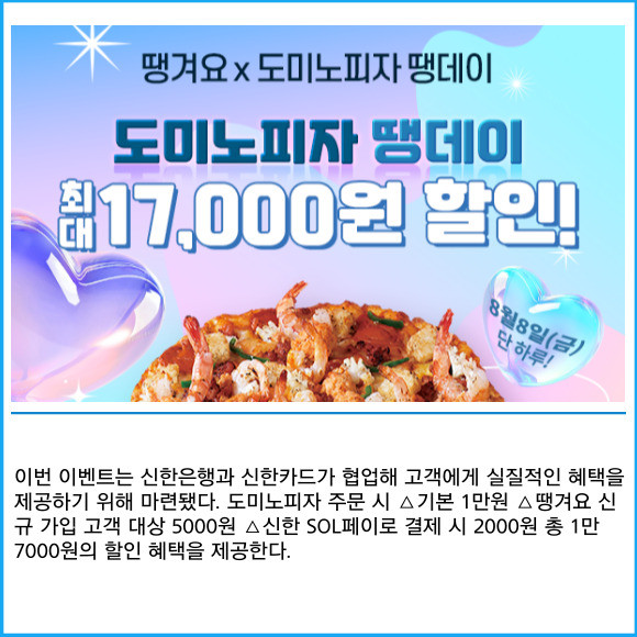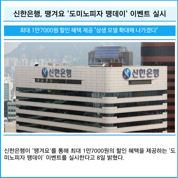 [프라임경제] 신한은행이 '땡겨요'를 통해 최대 1만7000원의 할인 혜택을 제공하는 ‘도미노피자 땡데이’ 이벤트를 실시한다고 8일 밝혔다.