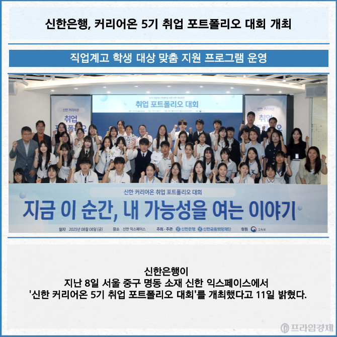 [프라임경제] 신한은행이 지난 8일 서울 중구 명동 소재 신한 익스페이스에서 '신한 커리어온 5기 취업 포트폴리오 대회'를 개최했다고 11일 밝혔다.