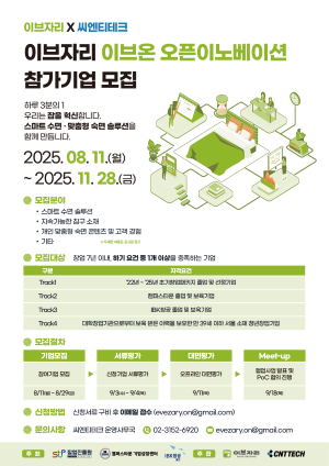 [프라임경제] 씨엔티테크(대표 전화성)와 이브자리가 공동 주관하는 오픈이노베이션 프로그램 '이브온(EVE-ON) 오픈이노베이션'이 참여 기업을 모집한다.