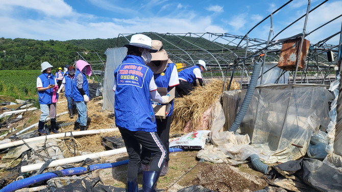 센터와 자원봉사자 70여 명이…산청군 신안면 소재 침수 피해 지역 방문해 피해 복구에 힘을 보태