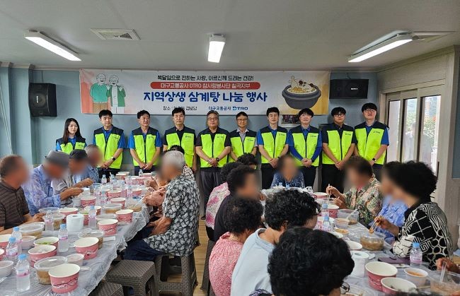 [프라임경제] 대구교통공사(사장 김기혁) 참사랑봉사단 칠곡지부는 지난 7일 북구 국우동 행정복지센터와 함께 동호동 관내 어르신 60여 세대를 대상으로 '어르신 건강기원 삼계탕 나눔 행사'를 개최했다.