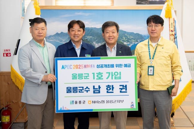 [프라임경제] 울릉군은 11일 남한권 군수가 올가을 경북 경주에서 개최하는 APEC 정상회의의 성공적 개최를 응원하고자 NH농협은행에서 출시한 'APEC 2025 KOREA 성공개최를 위한 예금'에 울릉군 1호로 가입하며 동참했다.