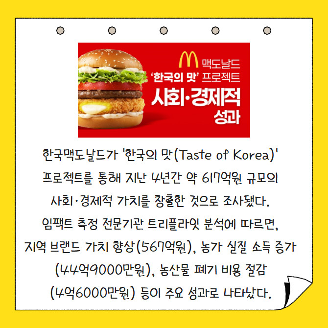 [프라임경제] 한국맥도날드가 '한국의 맛(Taste of Korea)' 프로젝트를 통해 지난 4년간 약 617억원 규모의 사회·경제적 가치를 창출한 것으로 조사됐다. 임팩트 측정 전문기관 트리플라잇 분석에 따르면, 지역 브랜드 가치 향상(567억원), 농가 실질 소득 증가(44억9000만원), 농산물 폐기 비용 절감(4억6000만원) 등이 주요 성과로 나타났다.