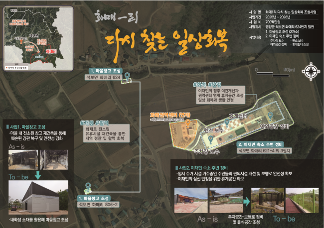 두 번째 화매1리 사업은 산불로 전소된 마을창고를 재건축하고, 이재민 숙소 주변의 환경 개선을 위해 주차장 및 안전펜스 보수, 주민 휴게 쉼터 조성 등을 통해 생활 안전 인프라를 강화하고, 주민들의 안정적인 정주환경을 조성하는 것을 목표로 한다.
