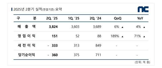 [프라임경제] 엔씨소프트(공동대표 김택진·박병무)가 2025년 2분기 실적 결산(연결기준) 결과 매출 3824억원, 영업이익 151억원, 당기순손실 360억원을 기록했다고 12일 밝혔다.