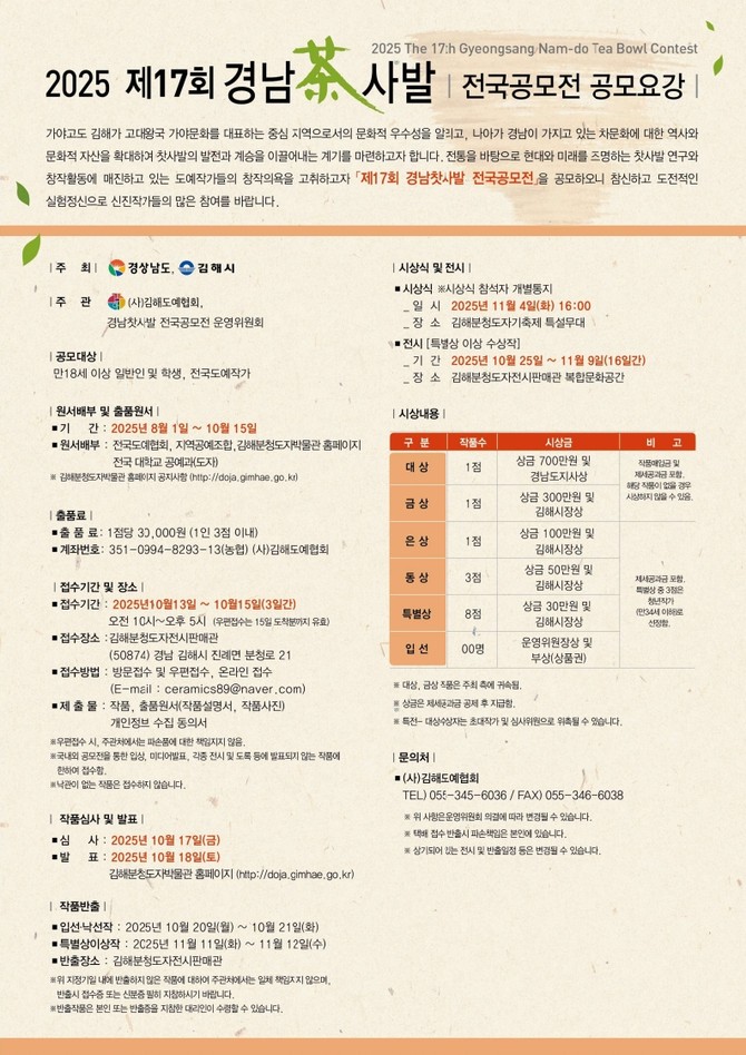 이번 공모전은 8월1일부터 김해분청도자박물관 홈페이지 등에서 원서배부를 진행하고 있으며, 10월13일부터 15일까지 방문 또는 우편·온라인 작품 신청을 받는다.