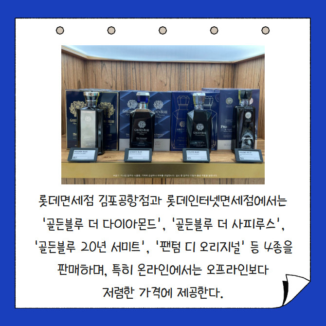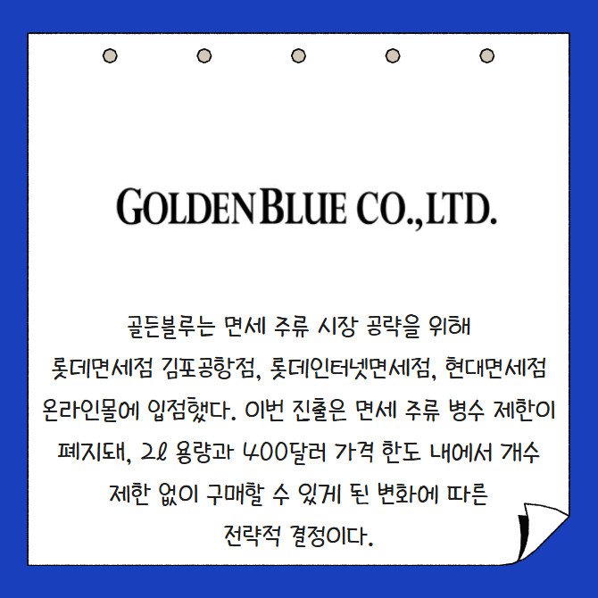 [프라임경제] 골든블루는 면세 주류 시장 공략을 위해 롯데면세점 김포공항점, 롯데인터넷면세점, 현대면세점 온라인몰에 입점했다. 이번 진출은 면세 주류 병수 제한이 폐지돼, 2ℓ 용량과 400달러 가격 한도 내에서 개수 제한 없이 구매할 수 있게 된 변화에 따른 전략적 결정이다.
