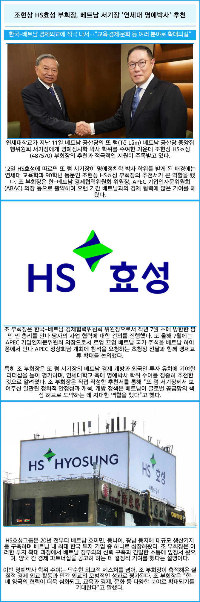 [프라임경제] 연세대학교가 지난 11일 베트남 공산당의 또 럼(Tô Lâm) 베트남 공산당 중앙집행위원회 서기장에게 명예정치학 박사 학위를 수여한 가운데 조현상 HS효성(487570) 부회장의 추천과 적극적인 지원이 주목받고 있다.
